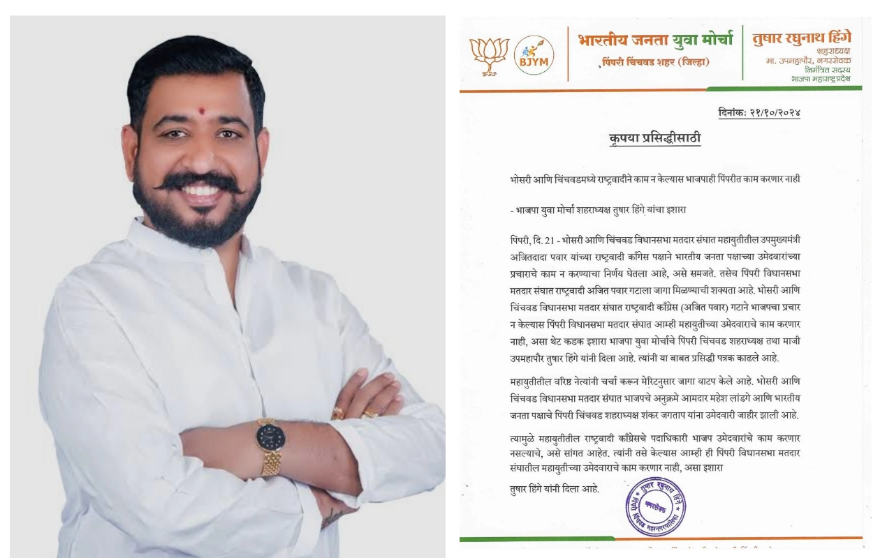 पिंपरी, दि. 21 – भोसरी आणि चिंचवड विधानसभा मतदार संघात महायुतीतील उपमुख्यमंत्री अजितदादा पवार यांच्या राष्ट्रवादी काँगेस पक्षाने भारतीय जनता पक्षाच्या उमेदवारांच्या प्रचाराचे काम न करण्याचा निर्णय घेतला आहे, असे समजते. तसेच पिंपरी विधानसभा मतदार संघात राष्ट्रवादी अजित पवार गटाला जागा मिळण्याची शक्यता आहे. भोसरी आणि चिंचवड विधानसभा मतदार संघात राष्ट्रवादी काँग्रेस (अजित पवार) गटाने भाजपचा प्रचार न केल्यास पिंपरी विधानसभा मतदार संघात आम्ही महायुतीच्या उमेदवाराचे काम करणार नाही, असा थेट कडक इशारा भाजपा युवा मोर्चाचे पिंपरी चिंचवड शहराध्यक्ष तथा माजी उपमहापौर तुषार हिंगे यांनी दिला आहे. त्यांनी या बाबत प्रसिद्धी पत्रक काढले आहे.