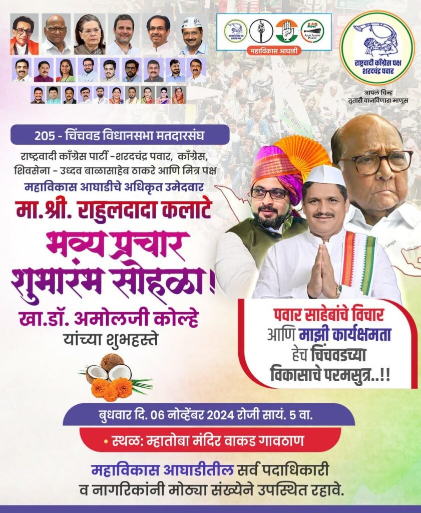 खासदार डॉ. अमोल कोल्हे, महाविकास आघाडीचे उमेदवार राहुल कलाटे यांच्या हस्ते ग्रामदैवत म्हातोबा देवाच्या चरणी श्रीफळ फोडून प्रचाराचा शुभारंभ होणार आहे. यावेळी महाविकास आघाडीतील राष्ट्रवादी काँग्रेस शरदचंद्र पवार पक्ष, काँग्रेस पक्ष, शिवसेना उद्धव बाळासाहेब ठाकरे पक्ष यांच्यासह घटक पक्षातील विविध पक्ष व संघटनांचे पदाधिकारी कारकर्ते व चिंचवड विधानसभा क्षेत्रातील व वाकड गावातील ग्रामस्थ हजारोच्या संख्येने उपस्थित होणार आहेत.