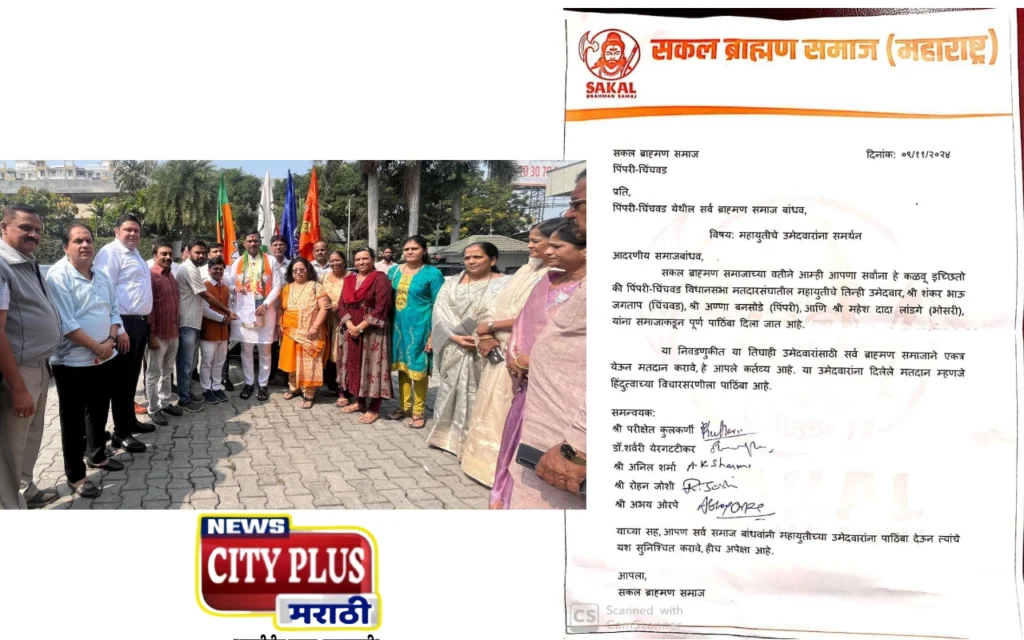 चिंचवड : प्रतिनिधी, ९ नोव्हेंबर २०२४ – पिंपरी चिंचवड शहर सकल ब्राम्हण समाजाच्या वतीने भाजप – शिवसेना – राष्ट्रवादी काँग्रेस – रिपाइं (आठवले) मित्रपक्ष महायुतीचे उमेदवार शंकर जगताप यांना जाहीर पाठींबा दिला आहे. संघटनेच्या पदाधिकाऱ्यांनी जगताप यांची भेट घेत त्यांना पाठींब्याचे पत्र दिले.