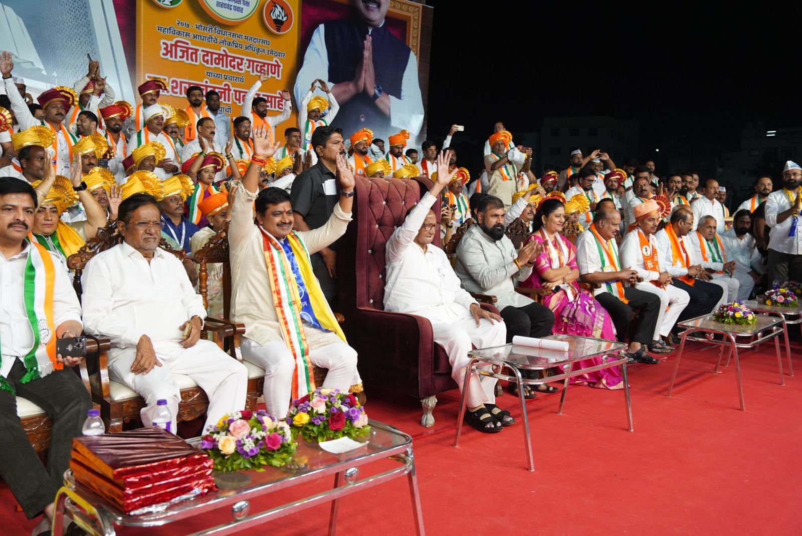 महाविकास आघाडी राष्ट्रवादी काँग्रेस शरद चंद्र पवार पक्षाचे भोसरी विधानसभेचे अधिकृत उमेदवार अजित गव्हाणे यांच्या प्रचारार्थ बुधवारी भोसरीतील गाव जत्रा मैदानावर सभेचे आयोजन करण्यात आले होते. यावेळी शिवसेनेचे उपनेते सचिन अहिर, राष्ट्रवादीचे पिंपरी चिंचवड शहराध्यक्ष तुषार कामठे, काँग्रेसचे शहराध्यक्ष कैलास कदम, शिवसेना (उबाठा) शहराध्यक्ष ॲड. सचिन भोसले, आम आदमी पार्टीचे शहराध्यक्ष चेतन बेंद्रे, माजी महापौर आझम पानसरे, संजोग वाघिरे, माजी आमदार विलास लांडे , गौतम चाबुकस्वार, जगन्नाथ शेवाळे, ज्येष्ठ नेते प्रकाश बापू म्हस्के, शिवसेनेच्या पुणे जिल्हा संघटिका सुलभा उबाळे, ज्येष्ठ सामाजिक कार्यकर्ते मानव कांबळे, महाविकास आघाडी भोसरी मतदारसंघाचे उमेदवार अजित गव्हाणे ,पिंपरीच्या उमेदवार सुलक्षणा शीलवंत, तसेच महाविकास आघाडीचे आणि माजी पदाधिकारी यावेळी उपस्थित होते.